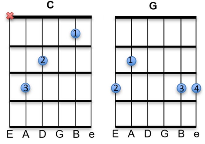 On the C chord, make sure to remove the low E string from the played strings. Ideally this is done by muting the string (often with the use of the thumb). I’ll give a demonstration of this in the video component below.